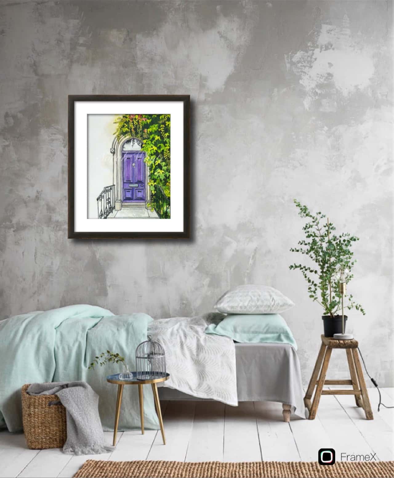This watercolor and ink painting is a memory of a beautiful facade I came across in Tralee, Ireland, done in a line-and-wash technique. Strolling through this village on a quiet Sunday afternoon, I was stopped in my tracks by this enchanting purple door, covered in lush ivy. It struck me that this ancient world was full of story and mystery, and all I had to do was open the door to understanding. Cheers to discovery and destiny! Specifications Original Size: 810" Medium: Watercolor giclee print on cold press fine art paper This piece was painted by professional watercolor artist Sarah Whyte, whose work blends fine detail with soft, expressive color. Part of her signature watercolor and line-and-wash collection.