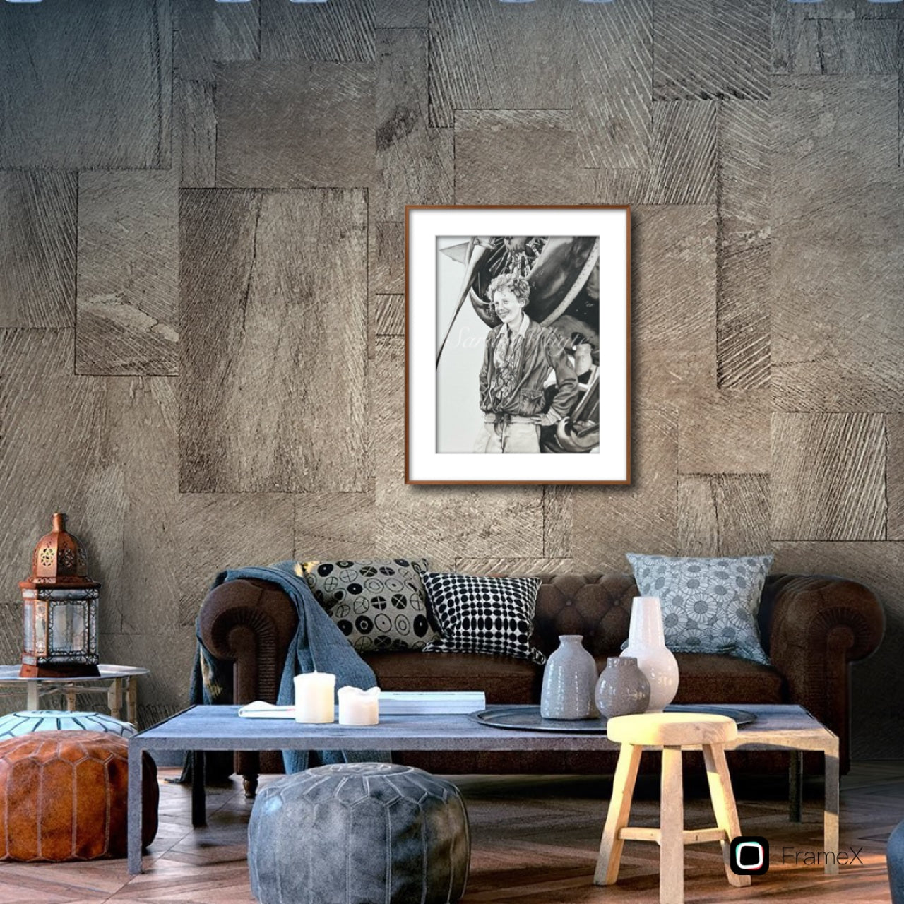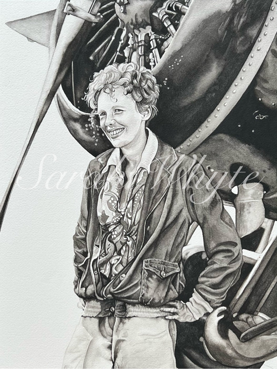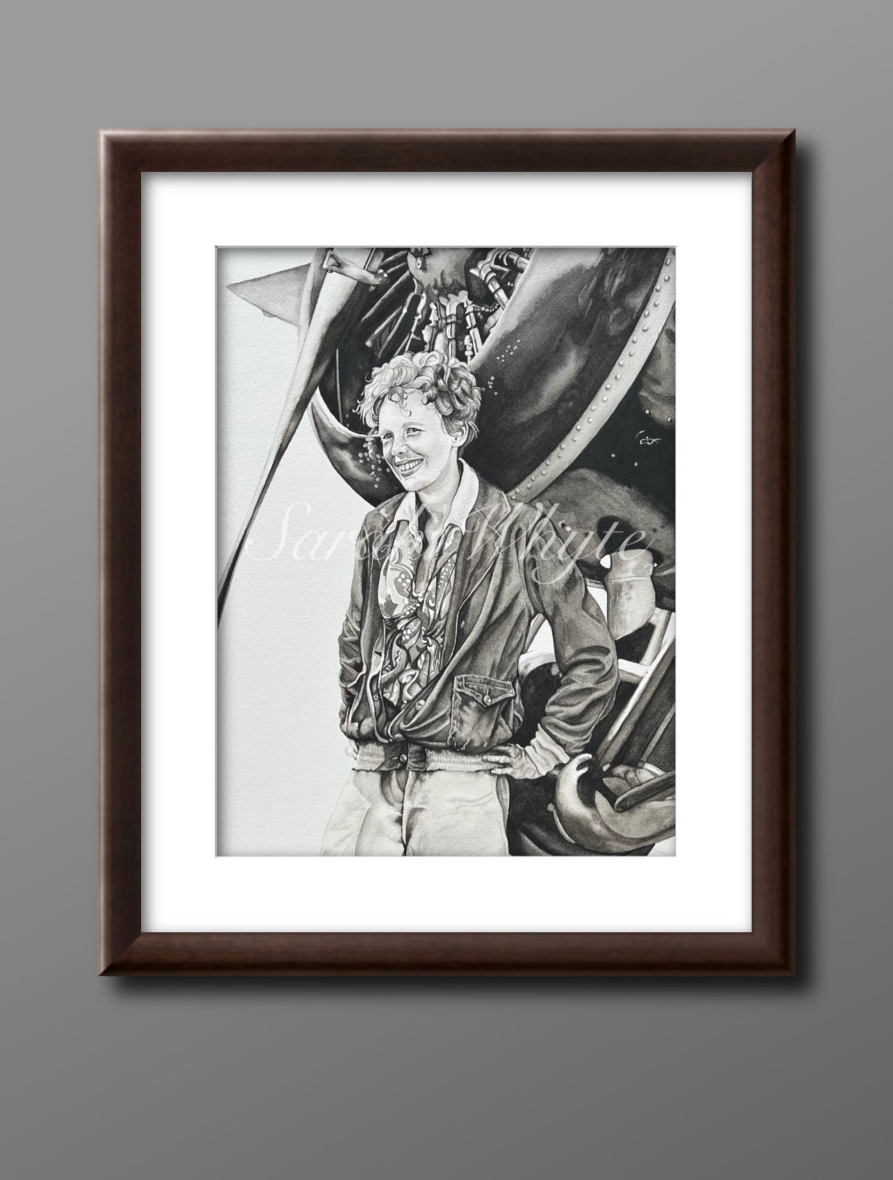 Experience the nostalgia and passion of early aviation with an archival reproduction of the original 1216 watercolor painting, 'Fly Girl.' This breathtaking piece, imbued with warm sepia tones, faithfully captures a defining moment from a 1930 photograph of the legendary Amelia Earhart. Standing tall and poised in front of her airplane, Earhart's resolve and determination are brought to life with each carefully crafted brush stroke. The artist's technique delivers a fresh perspective while staying true to the era, echoing the groundbreaking spirit of Earhart and her contributions to aviation and women's rights. The sepia-toned palette adds a timeless quality, enhancing the vintage charm and historical depth of the painting. This powerful and inspiring depiction of one of the world's most beloved pioneers serves as a statement piece and a conversation starter. Whether it's for your study, office, or living room, 'Fly Girl' is more than just a painting; it's a symbol of relentless ambition and daring spirit. A tribute to the legendary Amelia Earhart, this artwork is a must-have for aviation enthusiasts, history buffs, and art collectors alike. Specifications Original Size: 1216" Medium: Watercolor giclee print on cold press fine art paper This piece was painted by professional watercolor artist Sarah Whyte, whose work blends fine detail with soft, expressive color. Part of her signature watercolor and line-and-wash collection.