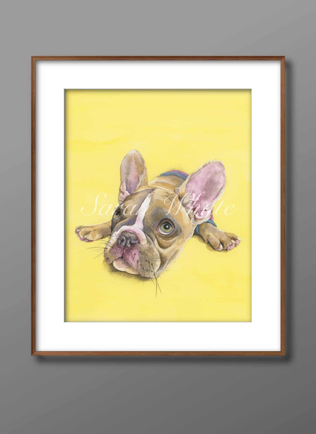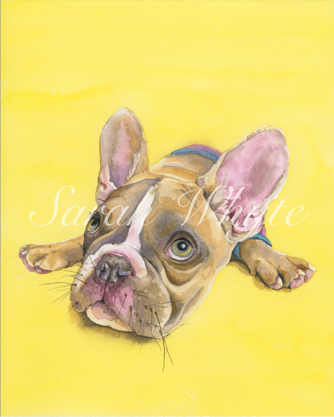 This French Bulldog is living her best life in the sun! She's waiting patiently for her treats, hoping you'll drop a crumb as she tries to act cool. One of the watercolor paintings created while living MY best life in the Arizona sun. Specifications Original Size: 810" Medium: Watercolor giclee print on cold press fine art paper This piece was painted by professional watercolor artist Sarah Whyte, whose work blends fine detail with soft, expressive color. Part of her signature watercolor and line-and-wash collection.