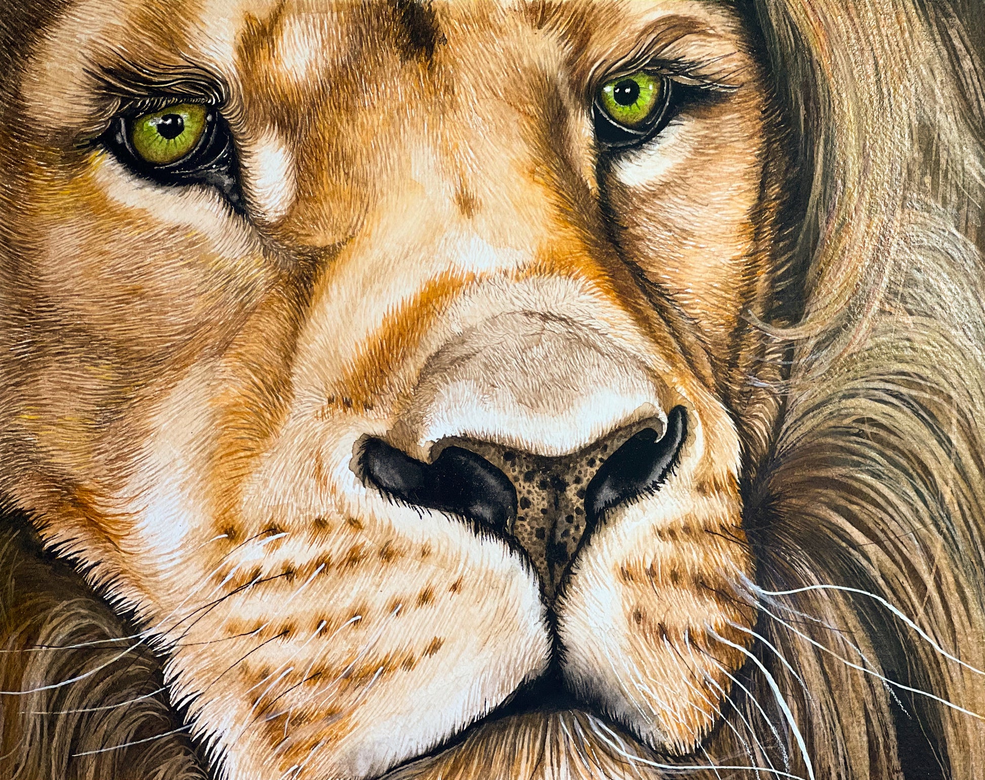 There's something powerful about locking eyes with a lionand in this close-up watercolor portrait, that intensity takes center stage. From the piercing gaze to the fine detail in each strand of mane and whisker, this painting invites you to pause and feel the quiet strength behind those eyes. Painted with care and precision, this piece captures not just the beauty of the animal, but the spirit within. A bold, soulful addition to any spaceperfect for wildlife lovers, art collectors, or anyone drawn to the quiet roar of nature.