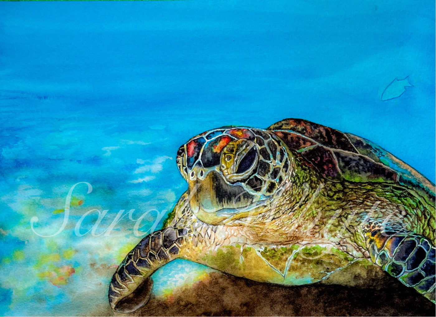 The largest loss of life to the green sea turtle is attributed to "bycatch," which occurs when sea turtles are caught by netting for shrimp and other fish. Overharvesting and illegal trade are the second most harmful practices to the green sea turtle. Lastly, habitat loss deeply impacts the green sea turtle population. Coastal development, unmonitored beach traffic, and other invasive human activities contribute to a massive environmental loss, and climate change and global warming affect multiple aspects of the green sea turtle's environment. https://www.americanoceans.org/species/green-sea-turtle/ This watercolor painting is a special celebration of an endangered species.