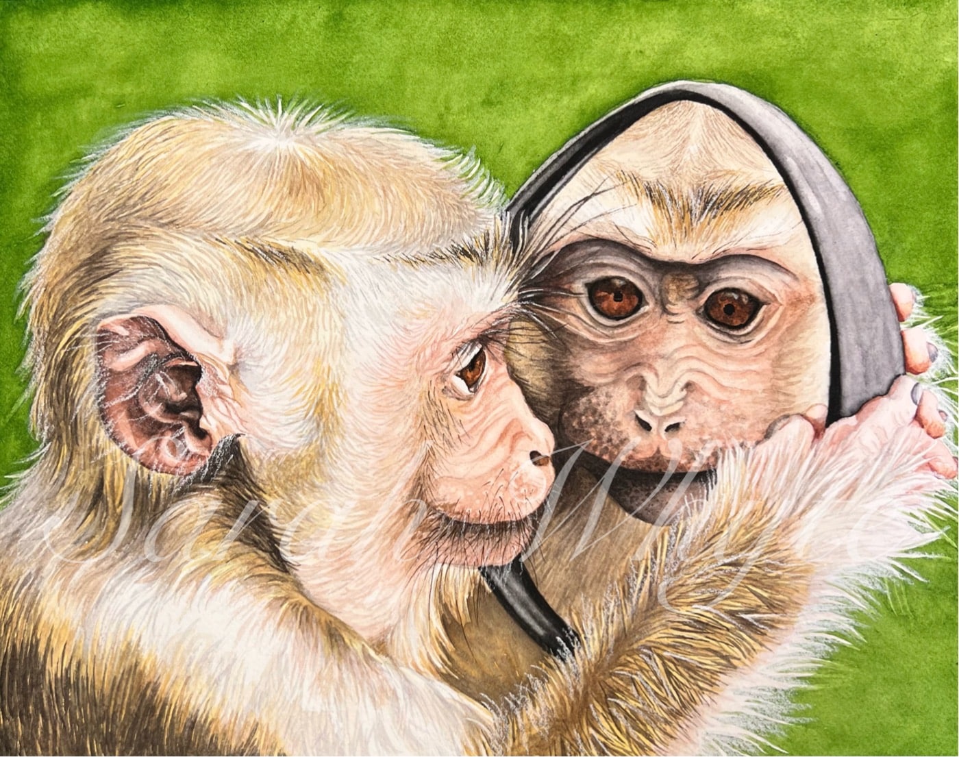 This watercolor print features a Rhesus monkey looking at itself in a mirror. The first monkey to be rocketed into the stratosphere, Rhesus Macaques are found in both tropical and temperate habitats, and are the most studied nonhuman primate. If you've ever traveled through Asia, you've probably seen these guys thriving in human settlements, where they benefit from plentiful food sources and handouts from tolerant residents and tourists.