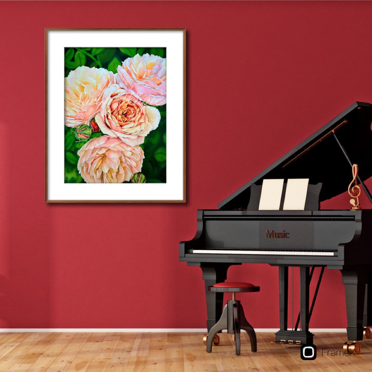 Introducing 'Summer Splendor', a captivating 1216 archival reproduction of the Watercolor that encapsulates the serene beauty of a late summer afternoon. This piece features an enchanting display of full-bloom roses and delicate rosebuds set against a backdrop of softly blurred leaves and stems. Each rose, painted with intricate precision, is an eruption of vibrant yellow and fiery red hues at the base, gradually fading into soft white and blushing pink tones on the outer petals. Inspired by the fleeting beauty of nature's moments, the artist masterfully captures the roses' intricate layers and velvety texture, giving a sense of depth and realism to the piece. The out-of-focus backdrop provides a calming contrast, guiding the viewer's eye towards the main subjects. The exquisite attention to detail, paired with the artist's understanding of light and color, renders 'Summer Splendor' a delight for the senses. Ideal for anyone seeking to bring a touch of nature's elegance into their living space, 'Summer Splendor' is a breathtaking addition to any art collection. This piece is not just a painting, but a celebration of life, growth, and the captivating charm of the simple yet extraordinary rose.