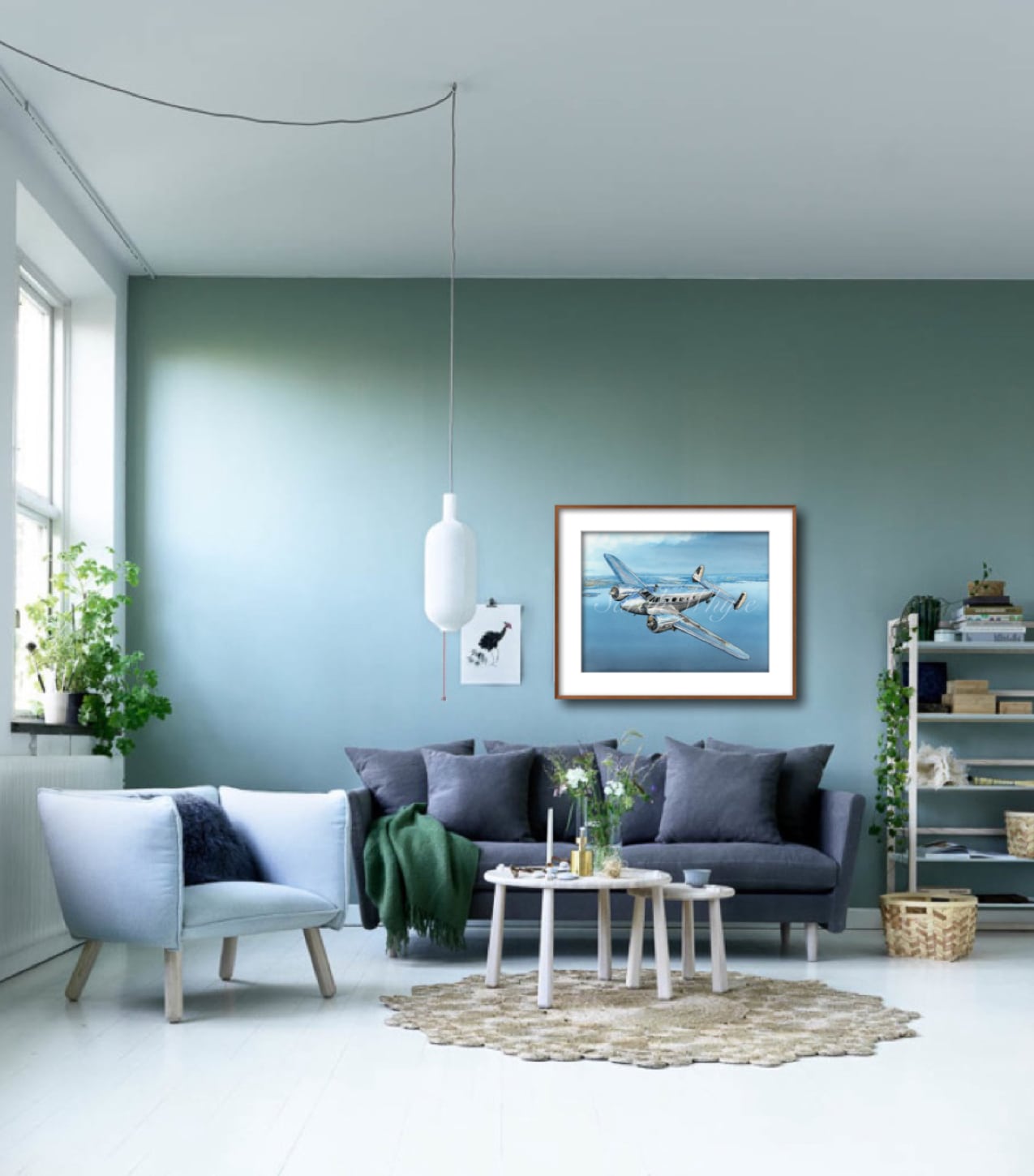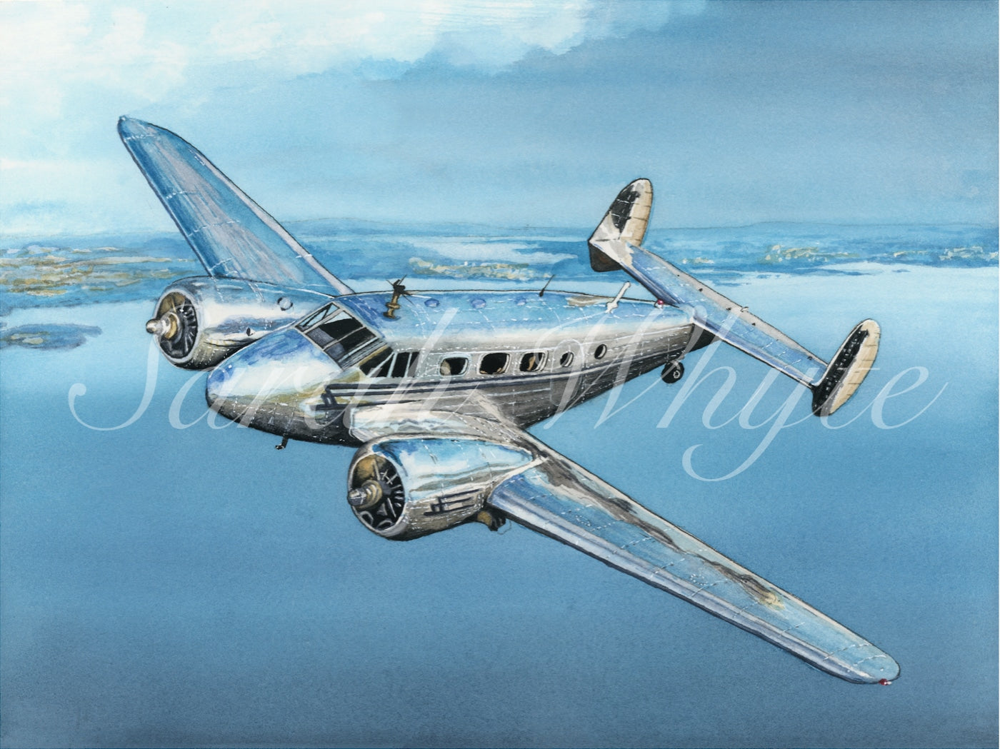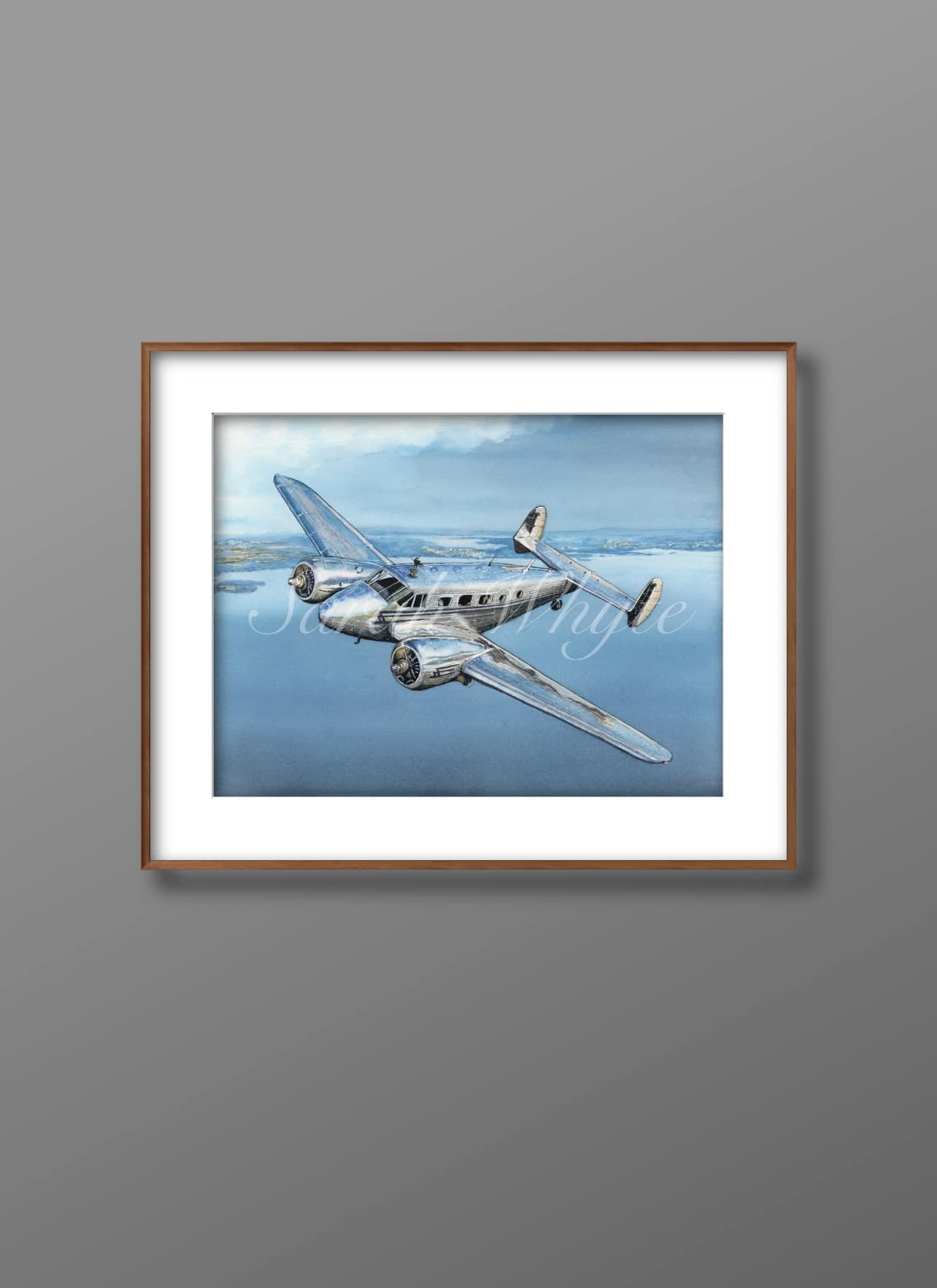 This special watercolor painting commemorates the 1951 Beechcraft Model 18 airplane, also known as the "Twin Beech," which was a 6- to 11-seat, twin-engine produced from 1937 to 1969 in the United States. During and after World War II, over 4,500 Beech 18s were used in military service, becoming, in the post-war era, the pre-eminent "business aircraft" and "feeder airliner".